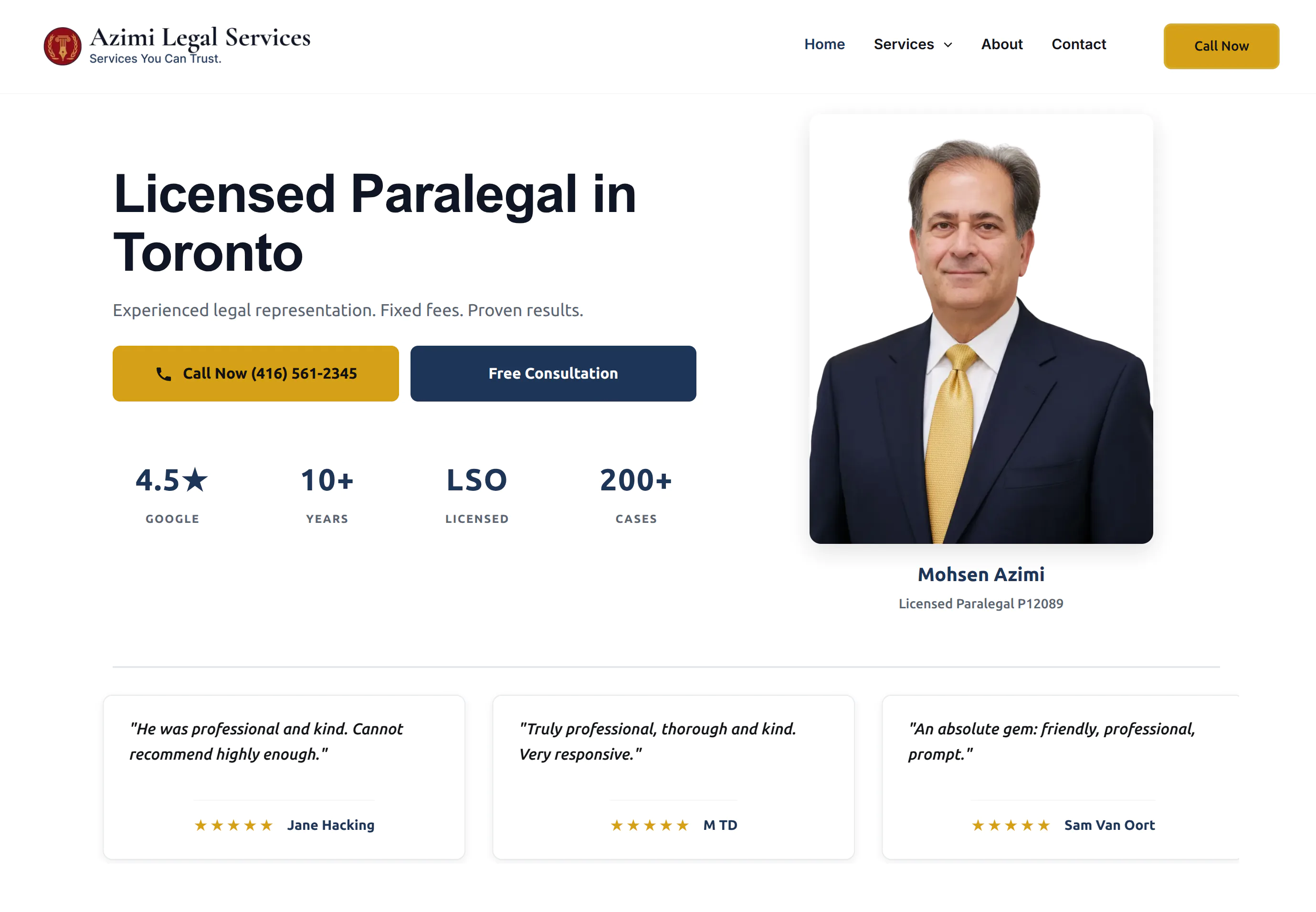 For a professional services business serving the GTA, local SEO is not optional. People search for "paralegal near me", "landlord tenant board representation toronto", "notary public mississauga" - local intent dominates legal services queries. The local SEO work for Azimi Legal Services focused on Google Business Profile optimization and strategic citation building.